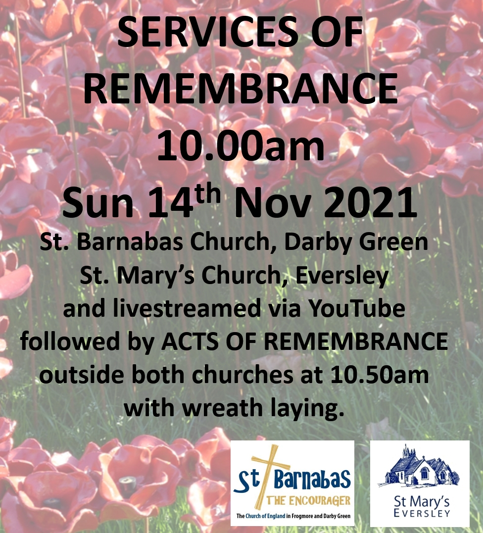 Services of Remembrance will take place in both churches in the Benefice at 10am on Sunday 14th November 2021, followed by Acts of Remembrance outside those churches at 10.50am as we gather as communities to pay our respects.